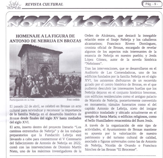LA REVISTA ALDEHUELA SE HACE ECO DEL HOMENAJE A NEBRIJA EN LAS BROZAS (CÁCERES) CON LA PARTICIPACIÓN DEL CRONISTA OFICIAL JUAN FRANCISCO RIVERO DOMÍNGUEZ