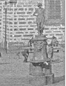 Hoy colocamos una de las más antiguas fotografías que tenemos de esta estatua de hierro colado. Posiblemente se pueda enmarcar entorno a 1897 – 1901 y en ella vemos como en su origen la base estaba dispuesta en otra dirección quedando las fauces del fauno bajo los pies de la misma.