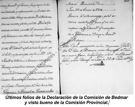 Jaén, 22 de enero de 1754. Llévese a la Contaduría Principal de Única Contribución para que se incorpore en la operación que corresponde. Vereterra. Diego Francisco de Retana. Esta Copia corresponde con las Respuestas Generales de la Villa de Bedmar que se compone de 39 hojas rubricadas por mí el Contador Principal que la corregí en Jaén a 23 de julio de 1754. Rúbrica”.