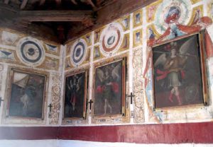 El interior está completamente decorado con pinturas murales que enmarcan los lienzos en que se representan los ángeles. Todo ello anda bastante dañado por el paso de los años, pues el conjunto está cumpliendo actualmente los tres siglos exactos de vida. Las pinturas, representando molduras, medallones y cortinajes, encuadran frases que identifican los símbolos que portan los personajes angélicos con elementos de la letanía laurentiana. Aunque en algún momento, quizás para su limpieza, se desmontaron y luego recolocaron inadecuadamente. Por ejemplo, vemos que bajo la inscripción de Fons Aqua, figura el Ángel con una torre; y bajo la Scala Coeli, el Ángel con un lirio. Así mismo, el espacio reservado a la Stella matutina, donde se aloja el Ángel con estrella, fue enmarcado con un cortinaje escenográfico.