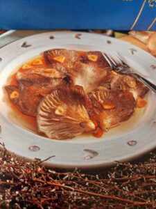 .- Compren sobre 400 d de setas de cultivo (Pleurotus) de buen tamaño. Làvenlas y póngajas,a macerar en un vino rosado ligeramente rebajado con un poco de agua.. Tiempo de maceracion : 45 minutos .En una sartén con aceite , al fuego , doren tres dientes de ajo laminados. Cuando tomen color , añadan las setas escurridas y saladas al gusto.