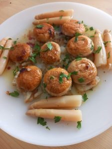 Pues ayer , por el aquel de hacer la comora un lunes , vimos en el «super» que estaban colocando unas bandejas ( 300 g) , recién recibidas , de champiñones , tamaño mediano grande ,de cultivo . Preciosos , blancos , gruesos semiesfericos…Una tentación piadosa.