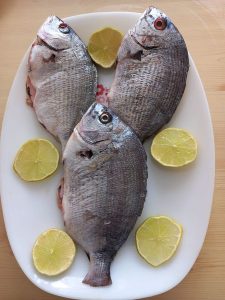 .- Después de tenerlas en congelador durante 4 días para evitar posible presencia de anisakis, las escamamos , evisceramos y lavamos muy bien al chorro de agua fría. Secamos , salamos al gusto y dejamos reposar con unas rodajas de limón.