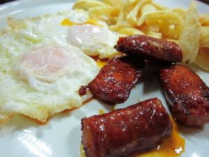 ¡Ay, Dios mío! .- En Colunga no se embute androlla y hoy , con nieve en el Sueve , «el cuerpo me pide» huevos fritos y como no dispongo de ese riquísimo embutido me decidiré por chorizos colungueses , que son buenísimos.-. También lo dice el refranero : «El que no se conforma ye porque non quier».-