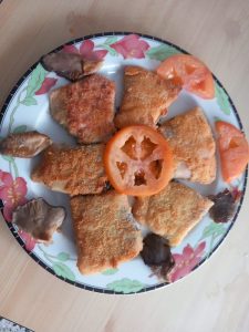 – Adornamos con trocitos de setas fritos y rodajas finas de tomate.
