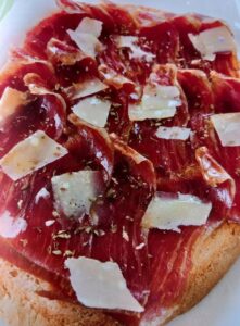 Fue y es costumbre popular en muchas comarcas españolas tostar una rebanada de pan ( de hogaza) , rociarla con aceite y colocar sobre ella un «algo de comer» ( jamón, cecina, embutido , tomate en rodajas…).