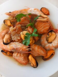 Así lo preparamos : Compramos 500 d de salmón de cultivo por la parte de la cabeza (cuello , pestorejos…) y seleccionamos la carne eliminando pieles y espinas. Troceamos y salamos. Doramos en aceite y reservamos en cazuela. En el aceite de fritura pochamos una cebolla y dos dientes de ajo picados en pequeño. Ya en su punto añadimos un caldo obtenido por cocción de la morralla eliminada del salmón.. Da unos hervores y llevamos a la cazuela del salmón. Agregamos un vaso de vino blanco , unos mejillones abiertos al vapor y 8 langostinos grandes eliminados el caparazón de las colas . Nuevos hervores ….y dispuesto el manjar para llevar a la mesa.
