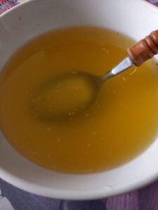En CASA PRUDO , que es la mía, lo preparamos de este modo : En una cazuela grande con agua , sin sal ,cocemos durante un tiempo largo, un trozo de morcillo , un cuarto de pollo , un hueso de cañada, un buen trozo de jamón, un puerro y una zanahoria. Al finalizar la cocción coloreamos con azafrán ,sazonamos con sal y colamos Y , claro. Como este caldin , muy sabroso , es plato de entrada , lo complementé con unas patatas asadas al horno servidas con mantequilla y un final , como postre, de queso fresco con miel.