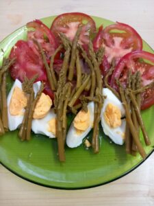 1 – ENTRADA. – Una ensaladina de bonito en aceite de oliva ( lata pequeña) complementada con tomate de Colunga , esparraguinos verdes de Perú elaborados en Navarra, huevo cocido y aderezada al gusto.