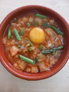 – Cuando el pisto estaba en su punto añadimos los espárragos , troceados , y los rehogamos en él. Coloreamos con pimentón , agregamos caldo de carne , rebanaditas muy finas de pan y dejamos cocer a fuego moderado durante unos 15 minutos.