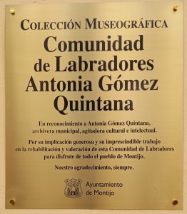 Hace unos días que en la fachada del Espacio Cultural Comunidad de Labradores de Montijo, ha sido colocada una placa en la que está el nombre de Antonia Gómez Quintana. Porque el proyecto de recuperación del edificio ha sido realizado por el actual equipo de Gobierno Municipal que lo llevaba en su programa, y por el empeño y tesón que puso desde hace años la archivera del Ayuntamiento, Antonia Gómez Quintana. Ella supo dar lustre al edificio y su contenido.