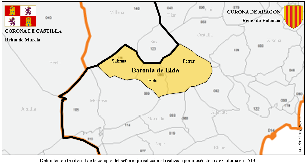 El 4 de septiembre de 1513 marcó un punto de inflexión en la historia de Elda. Aquella pequeña villa agrícola del sur del reino de Valencia, en la frontera con Castilla y con una abrumadora mayoritaria de población mudéjar que todavía hablaba la algarabía o el árabe dialectal, se regía por la Xara y la Sunna y rezaba en su mezquita mayor, dejaba de pertenecer al señorío de los Ruiz de Corella, condes de Cocentaina, en el que estaba integrada desde 1424, para pasar a manos de los Coloma Pérez-Calvillo, futuros condes de Elda.