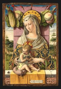 «La Virgen y el Niño», una obra pictórica de Carlo Crivelli, año de 1480. En este detalle de la Virgen y el Niño, los símbolos del bien y el mal aparecen en esta pintura como las manzanas y la mosca que simbolizan el pecado, el pepino y el jilguero hacen referencia a la redención y al alma.
