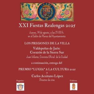 «LUGIA» EN LAS «XXI FIESTAS REALENGAS». Entrega del «Premio Lugia a la Cultura 2025» al director de cine, Carlos Aceituno, y conferencia del cronista oficial, Juan Infante Martínez. Día: Jueves, 14 de agosto. Hora: 21:00 horas. Lugar: Salón de plenos Ayuntamiento Valdepeñas de Jaén