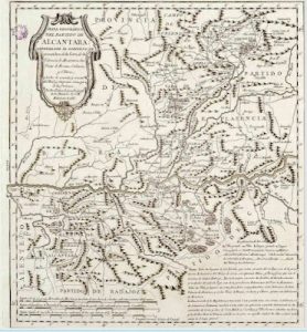 Concretamente, el mapa lleva el título en una cartela en la parte superior izquierda bajo el siguiente nombre: “Mapa geográfico del partido de Alcántara: comprehende el gobierno de su nombre, el de Gata, el de Valencia de Alcántara; las varas de Brozas Ceclavín y Cilleros, hecho de acuerdo y a costa del Real y Supremo Consejo de las Ordenes. Por don Tomás López, Geógrafo de los dominios de S.M. Madrid año de 1785”.