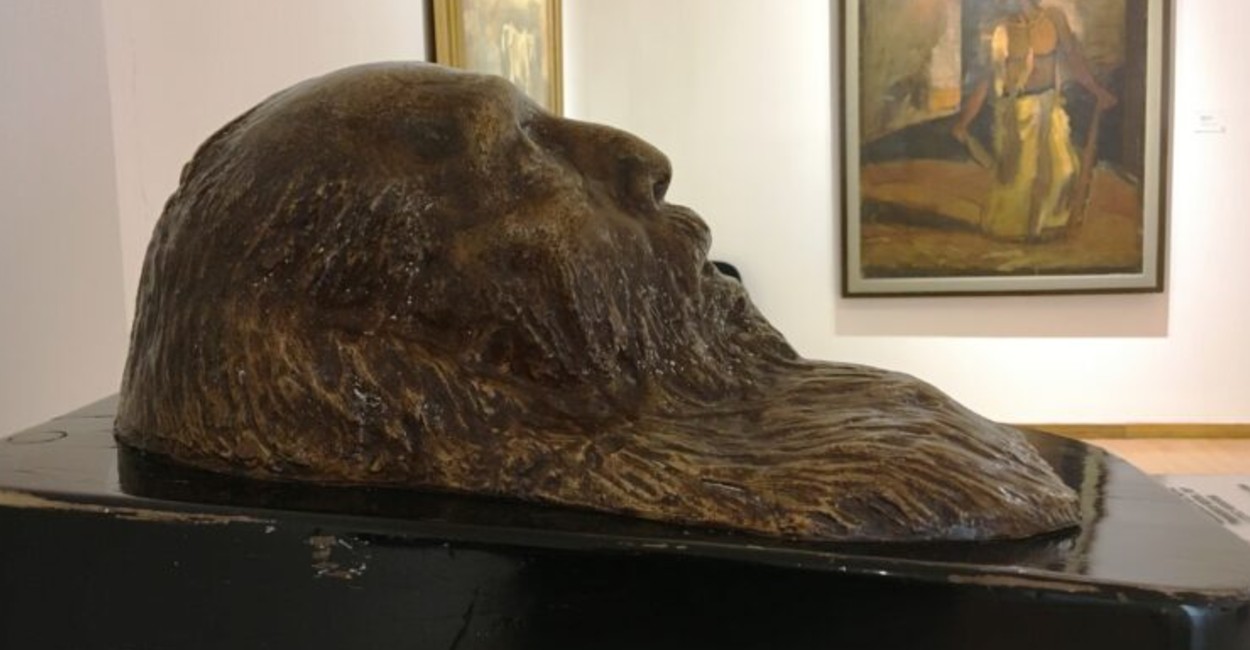Este retrato escultórico de bronce nos muestra a un cuerpo vigoroso pero con un rostro demacrado y con los ojos cerrados.