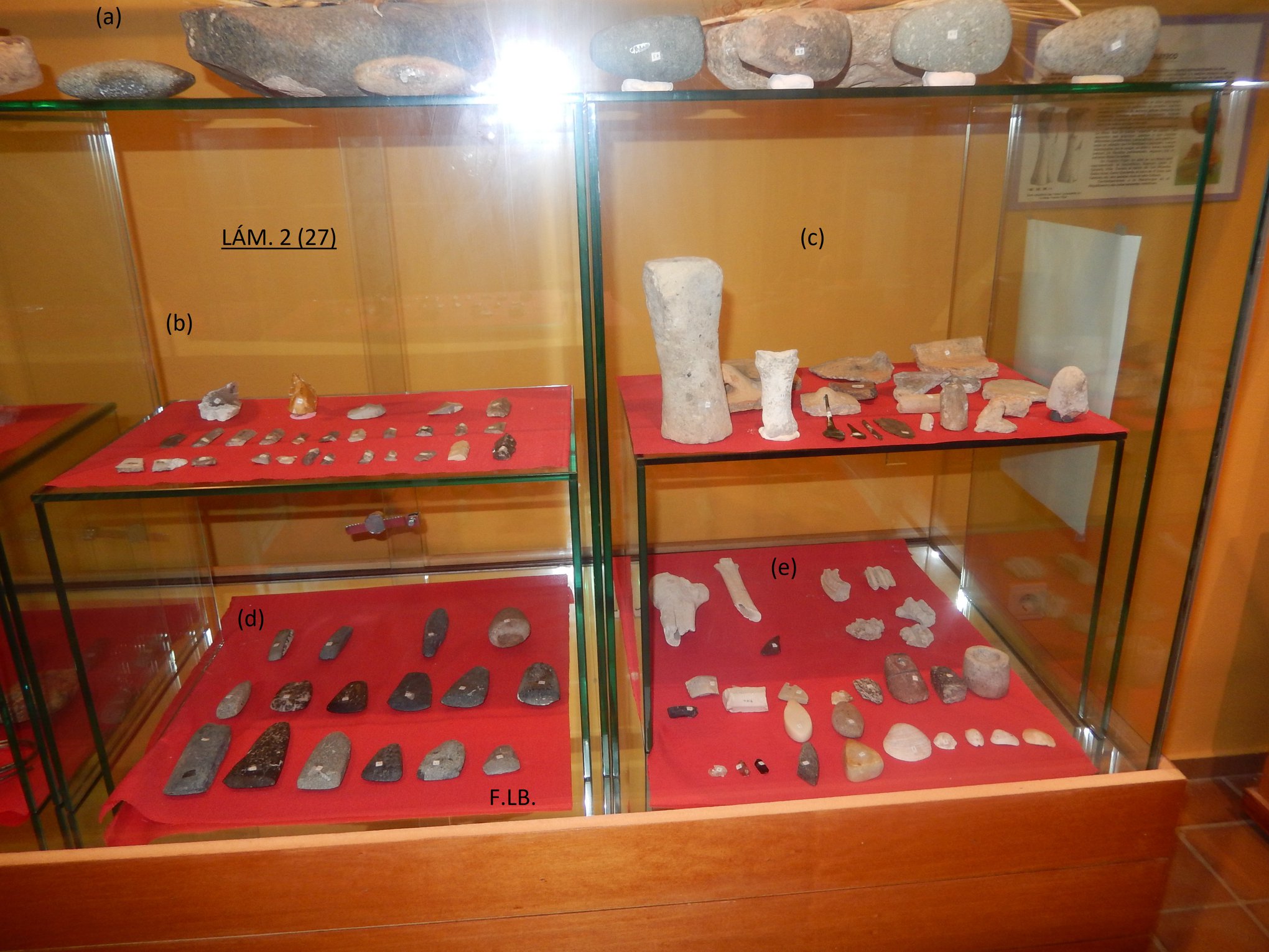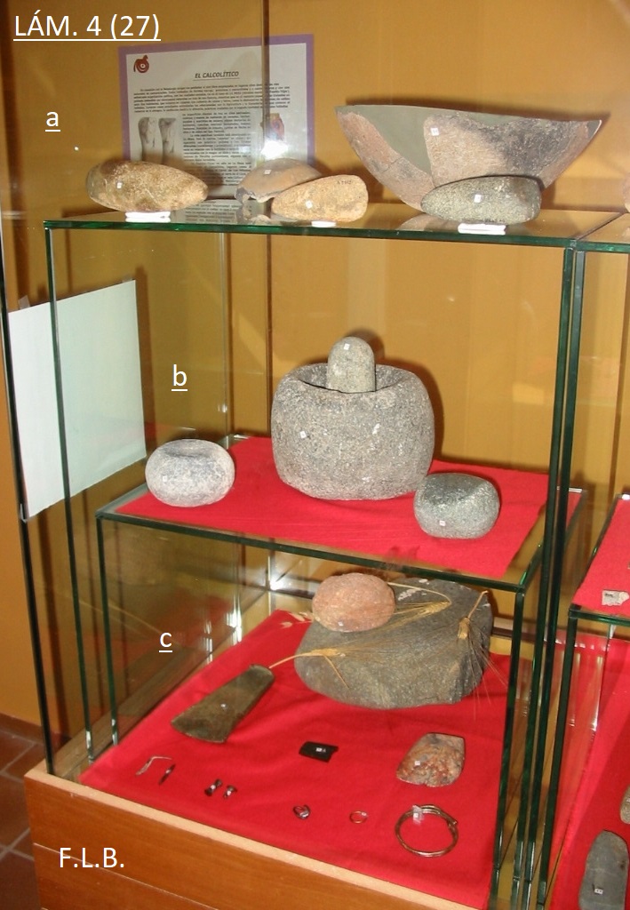 A la derecha de la LÁM. 1, se exponen piezas características del Eneolítico o Calcolítico (Edad del Cobre) y, a la izquierda, las de la Cultura Argárica o Bronce Medio (milenios III-I a. C.). Proceden en su mayoría de los yacimientos de La Mesa, de Las Cabezas y de una buena retahíla de zonas adyacentes a donde llegarían por diversas causas: por haberse establecido nuevos asentamientos secundarios, procedentes de arrastres… Todos los materiales se hallaron en superficie. OBSERVACIÓN DECIR QUE NO SE EXHIBEN DOS PIEZAS IGUALES, tanto en esta vitrina como en las que hemos tratado con anterioridad y otras que lo haremos posteriormente. Cuando no sea así, lo indicaremos.