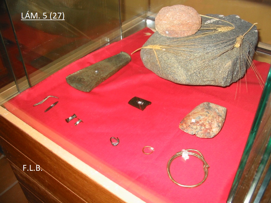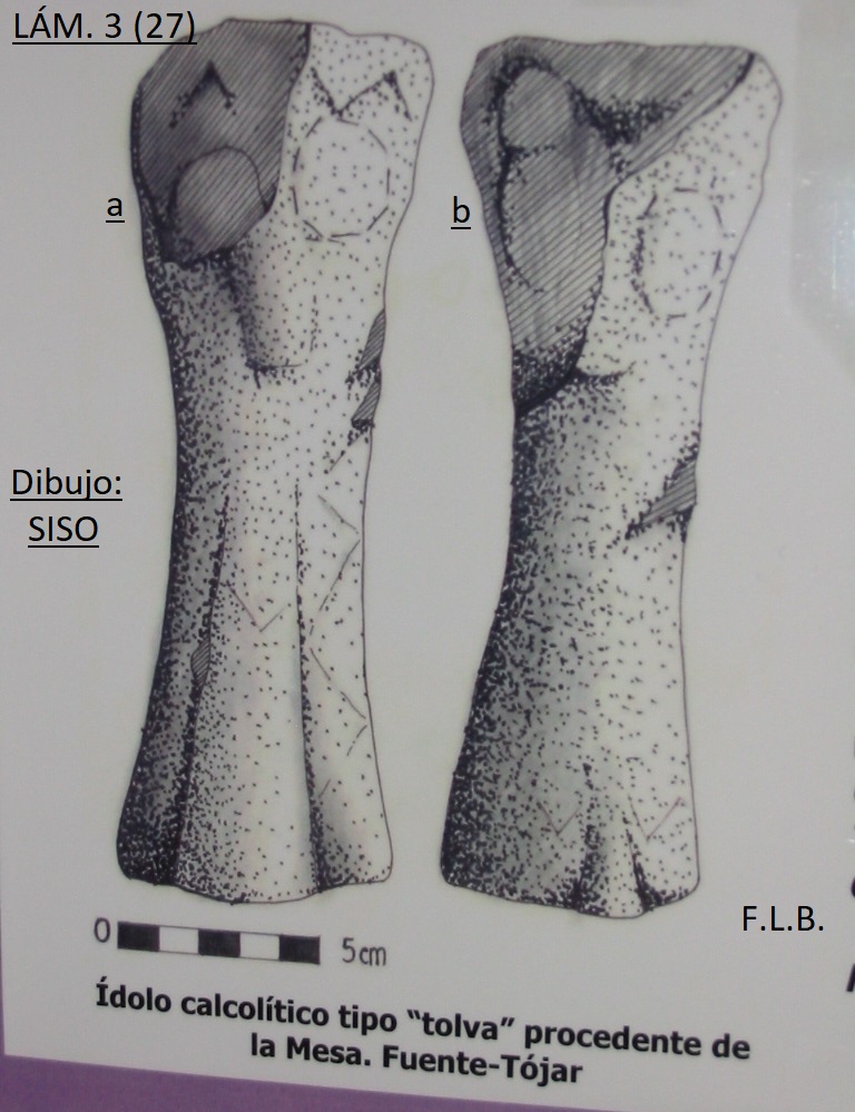 EL YACIMIENTO CALCOLÍTICO DE LA MESA (3.000 a.C.) hunde sus raíces en el Neolítico. Se sitúa al W. de Fuente-Tójar, a 687 m. sobre el nivel del mar, factor que favorece el control de una vasta y fértil zona agrícola y ganadera, así como del trasiego de personas y mercancías, amén de manantiales de agua, minas de almagra y materiales pétreos (gabros y pedernales). Tiene un km aproximadamente de eje mayor por varios cientos de m. de anchura. Posee magníficas defensas naturales y, cuando no, murallas levantadas a base de piedras irregulares montadas en seco. En el borde de este “monte isla” existen abundantes abrigos y cuevas rocosas. En piedra pulimentada (LÁM. 2, a, d y e) se conservan molinos circulares y naviformes, hachas, hachitas y geométricos votivos, cinceles, trituradores, alisadores, bordes de recipientes, colgantes y brazaletes, un morterito, placas de arquero, un disco… en sílex (LÁM. 2, b) hay lascas, buriles, hojas y hojitas, geométricos, dientes de hoz patinados por la siega, taladros, raspadores, puntas foliáceas, unas, y otras con pedúnculo y aletas… en hueso (LÁM. 2, c y e) existen molares de herbívoros, huesos humanos, ídolos sobre falanges de animales… las cerámicas (LÁM. 2, c) se presentan finas y bastas (algunas con la huella del fabricante) correspondientes a platos, botellas, cuencos de carena baja y hemiesféricos con bordes almendrados y engrosados, elementos de telar, cuernecillos… en metal (LÁM. 2, c) se guardan punzones, hojas y puntas “Palmela”. También se exponen colgantes de piedra y conchas marinas, así como restos de techumbres con impronta de cañizos (LÁM. 2, e). La vida espiritual está asimismo representada mediante un ídolo tipo “Tolva” de piedra relacionado con la fertilidad o sanación hallado próximo a una de las cuevas existentes en el cerro (LÁM. 2, c). En el volumen de la deidad se han grabado las facciones de la cara y una especie de túnica con los pliegues perfectamente marcados, tanto por la parte delantera como trasera (LÁM. 3, a y b). Sin saberse los motivos ni cuándo exactamente, los antiguos pobladores abandonaron el lugar asentándose en zonas próximas: Las Cabezas, El Tesorillo y cerrillos en torno a los ríos Salado, Caicena o Todos Aires o San Juan antes de su desembocadura en el Guadajoz (el antiguo Salsum flumen romano). LA CULTURA ARGÁRICA.- Diversas piezas de esta facies se han hallado en los sitios mencionados en último término, bastantes de ellas hoy presentes en el Museo Histórico Municipal de Fuente-Tójar (LÁM. 1, IZQ., LÁM. 4 y LÁM. 5). En la estantería de arriba (a) hay tres hachas o picos de piedras duras pulimentadas, la parte del cuerpo y base de una vasija y una escudilla de pasta negruzca debido a la cocción reductora que fue sometida con las superficies pulidas y alisadas. En la central (b) aparecen, en piedra pulimentada, un mortero (¿para obtener cerveza?), un machacador y dos martillos circulares relacionados con la metalistería. En la inferior (c) se muestran en piedra un molino circular, una mano de molienda y un hacha de fibrolita con el perfil del filo con una escotadura; dos hachas planas de bronce (una pequeña), puntas y pasadores en este mismo metal y en otros existen un anillo (bronce), otro de oro y una pulsera de plata (LÁM. 5). PARA MAYOR INFORMACIÓN: Martínez Santaolalla, J. (1935): “La cueva Neolítica andaluza”, en A.M.S.E.A.E.P. XIV, pp. 259-260; Ibídem: “La Cultura portuguesa en el Valle del Guadalquivir”, op. cit., pp. 260-261. Pericot García, L. (1973): Historia de España. Épocas Primitiva y Romana, T. I, pág. 106 (V Edición). Edit. Instituto Gallach. Barcelona. Leiva Briones, F. (1994): “Nuevos yacimientos arqueológicos en las áreas de influencia de Las Cabezas y de La Mesa de Fuente-Tójar”. Crónica de Córdoba y sus Pueblos III, pp. 277-301. Córdoba. Delgado Fernández, Mª. R. (1995): “El tránsito entre las Primeras Sociedades Productoras y las Culturas de la Metalurgia en el Sureste de Córdoba. Evolución y desarrollo: La Mesa”. Memoria de Licenciatura (inédita). Universidad de Córdoba, Área de Prehistoria. Córdoba, junio de 1995. Leiva Briones, F. (2014): Fuente-Tójar (Córdoba): aproximación a su arqueología e historia antigua. Fuente-Tójar, Córdoba: Ayuntamiento de Fuente-Tójar. Leiva Briones, F.; Jurado Ávalos, N.; y Osuna González, S. (2017): “El Museo Histórico Municipal de Fuente-Tójar (MHM): un Museo interdisciplinar”. En Boletín del Museo Arqueológico Nacional, 35-2017. Número extraordinario: 150 años de museos arqueológicos en España. Vol. 1, pp. 160-168. Madrid.
