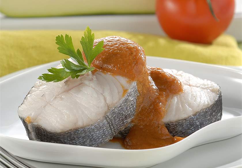 UNA MERLUCINA COCIDINA ACOMPAÑADA DE SALSINES.