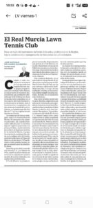 Hoy viernes 17 el diario LA VERDAD pública un texto mío sobre los orígenes del TENIS en la, Región. Justo hace un siglo, cuando el murciano Carlos Alcaraz proporciona tantas alegrias a los aficionados a este deporte y a todos los murcianos de la Región, se conmemora la inauguración de las dos primeras pistas reglamentarias en el espacio de la Condomina. Este deporte despegó en nuestra tierra de la mano del Real Murcia C F. Enhorabuena a los tenistas activos y aficionados, al cumplirse un siglo de su existencia formal en la Región.