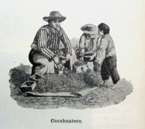 El cacahuatero. Con los frutos de su comercio aunados sobre petates de palma. De vez en vez rompía el silencio del entorno con su acostumbrado pregón: «¡Cacahuate tostado de horno, al buen cacahuate, pasen y preben!».