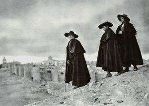 Con todo, la imagen detenida en el tiempo muestra una ciudad  “impregnada del ambiente guerrero y místico de su pasado”, dice Ortiz Echagüe, y añade: «Ávila, la mística, ofrece al asombro del caminante el recio cerco de sus austeras murallas asentadas sobre rocas de granito». Las murallas  se muestran entonces detrás de hombres ataviados con capas pardas y sombreros negros, y mujeres con amplios vestidos y sombreros de paja, aglutinando así el paisaje monumental de Ávila con el tipismo de sus gentes, como si la historia se hubieran paralizada en algún momento de su devenir.