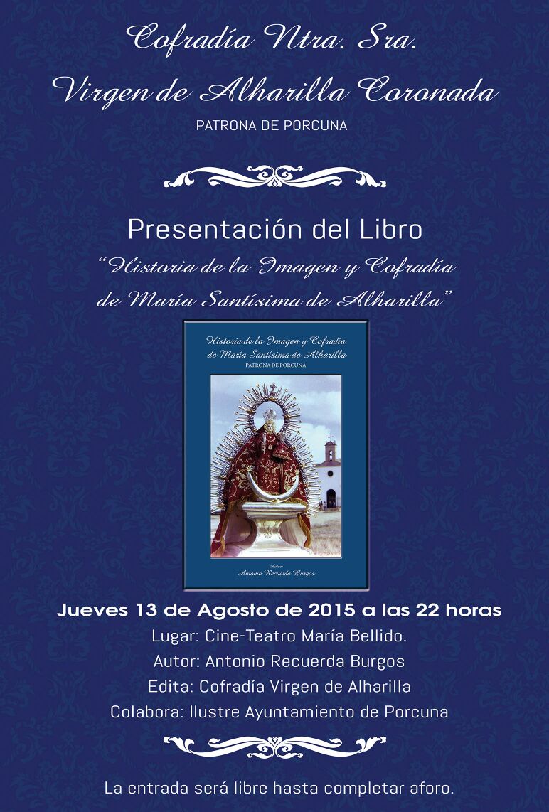 El día 13 de Agosto, jueves. Tuvo lugar la presentación del libro «Historia de la imagen y cofradía de María Santísima de Alharilla» de Antonio Recuerda Burgos, cronista oficial de Porcuna. El acto tuvo lugar en el Cine/Teatro María Bellido, contando con la asistencia de numeroso público entre los que se encontraban las autoridades civiles, instituciones religiosas y devotos en general.