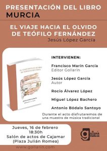 Mañana, jueves, 16 de febrero, en el salón de actos de Cajamar, en la plaza del Romea de Murcia, tendrá lugar la presentación del libro EL VIAJE HACIA EL OLVIDO DE TEOFILO Fernández, de JESÚS LÓPEZ GARCÍA.