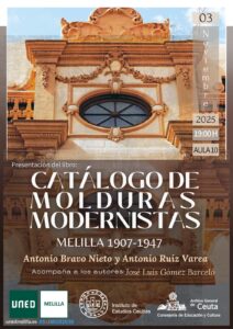 El próximo día 3 de noviembre, a las 19.00 horas y en el Aula 10 de la UNED de Melilla, presentaremos el libro Catálogo de Molduras Modernistas, Melilla 1907-1947. En este trabajo recogemos un total de 1.200 molduras o elementos ornamentales de su arquitectura, lo que evidencia su riqueza y diversidad.
