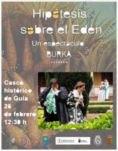 Entre las propuestas destaca la puesta en escena este domingo 26 de la obra ‘Hipótesis sobre el Edén’, un espectáculo teatral, en clave de comedia, que se representará en las calles del casco histórico, con danza y música que llegará nuevamente a este municipio de la mano de la compañía Burka Teatro, creadores de ‘Romeo y Julieta’. Los espectadores podrán viajar junto a sus actores, músicos y bailarines hasta el siglo XVI para profundizar en la historia de esta ciudad a través de esta obra, en forma de ruta teatralizada, a través de la sugerente propuesta: ¿Es Guía el Edén? El espectáculo dará comienzo a las 12:30 horas en la Plaza Grande.