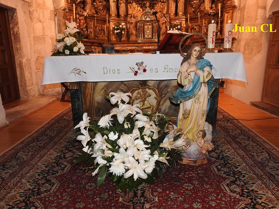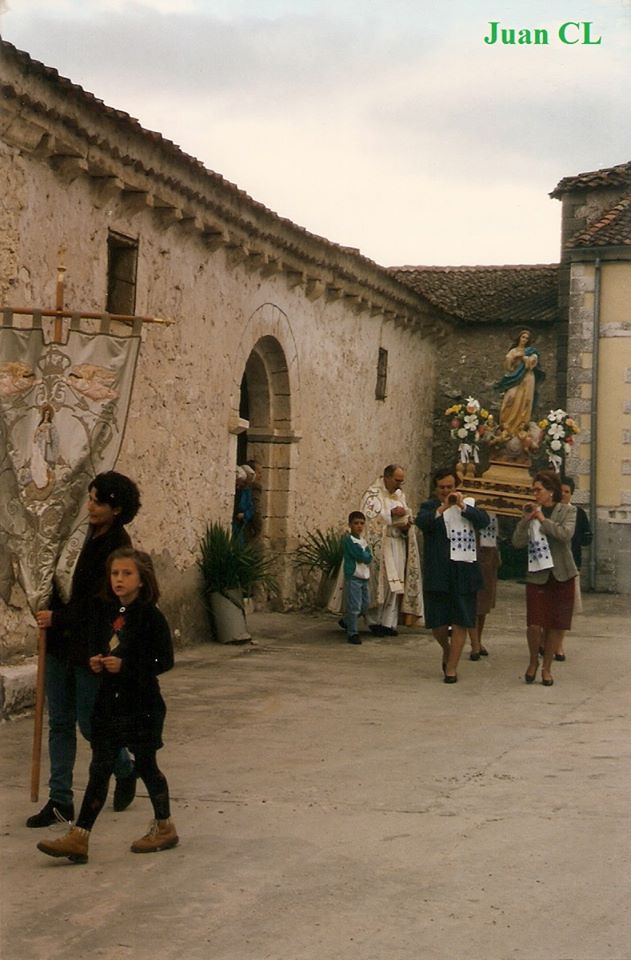 Para lo católicos mayo tiene una significación especial pues es el mes dedicado a la Virgen María, a la que se venera adornándola con flores y plegarias. En su día la asociación de las Hijas de María también le dedicaban una misa y la procesionaban, como en estas imágenes de 1997, pero hace años que se perdió esta tradición.
