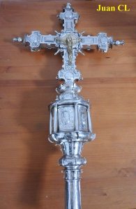 En la intercesión de los brazos se hallan grabadas en el anverso, la imagen del Crucificado, también de época posterior y factura bastante sencilla, con la ciudad de Jerusalén en forma esquemática, y en el reverso la figura repujada y sobredorada del patrón titular de la iglesia con su báculo y la vestimenta pontificia.