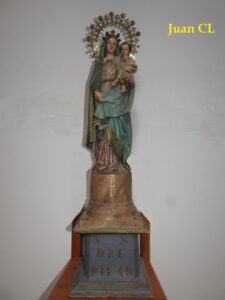 El 12 de octubre se celebra la festividad de la Virgen del Pilar. La imagen que se conserva en la iglesia de FUENTEPIÑEL fue donada en 1916 por Cipriano Villar e Inocencia Cuéllar. Y un 12 de octubre de 1934, fue también donado, pero por Juan Cuéllar Gómez y Engracia de Frutos Andrés, mis abuelos paternos, el reloj de cuerda fabricado en Aranda de Duero por Sebastián Merino, y que está instalado junto al altar de la Virgen del Rosario. Le acompaña un pequeño cuadro con una curiosa composición poética que da fe de ello obra del sacerdote D. Jenaro García Burgos, y 91 años después sigue marcando puntual las horas como el primer día.