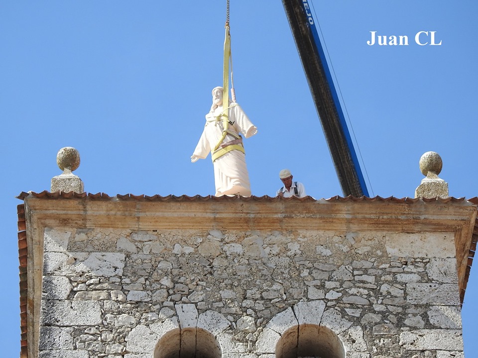 Fecha histórica la de hoy 28 de agosto de 2019 para FUENTEPIÑEL pues por fin se ha colocado en la torre de la iglesia la nueva imagen del Sagrado Corazón de Jesús, que sustituye a la que el 24 de junio de 2016 fue fulminada por un rayo.