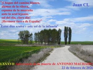 El 22 de febrero de 2026 se conmemora el LXXXVII aniversario de la muerte de Antonio Machado. Dejo aquí constancia de mi particular homenaje a este poeta español universal, uno de los fundadores de la Universidad Popular Segoviana, el precedente de la Real Academia de Historia y Arte de San Quirce, así como el programa con los actos previstos para esta jornada machadiana en la Casa Museo Antonio Machado de Segovia.