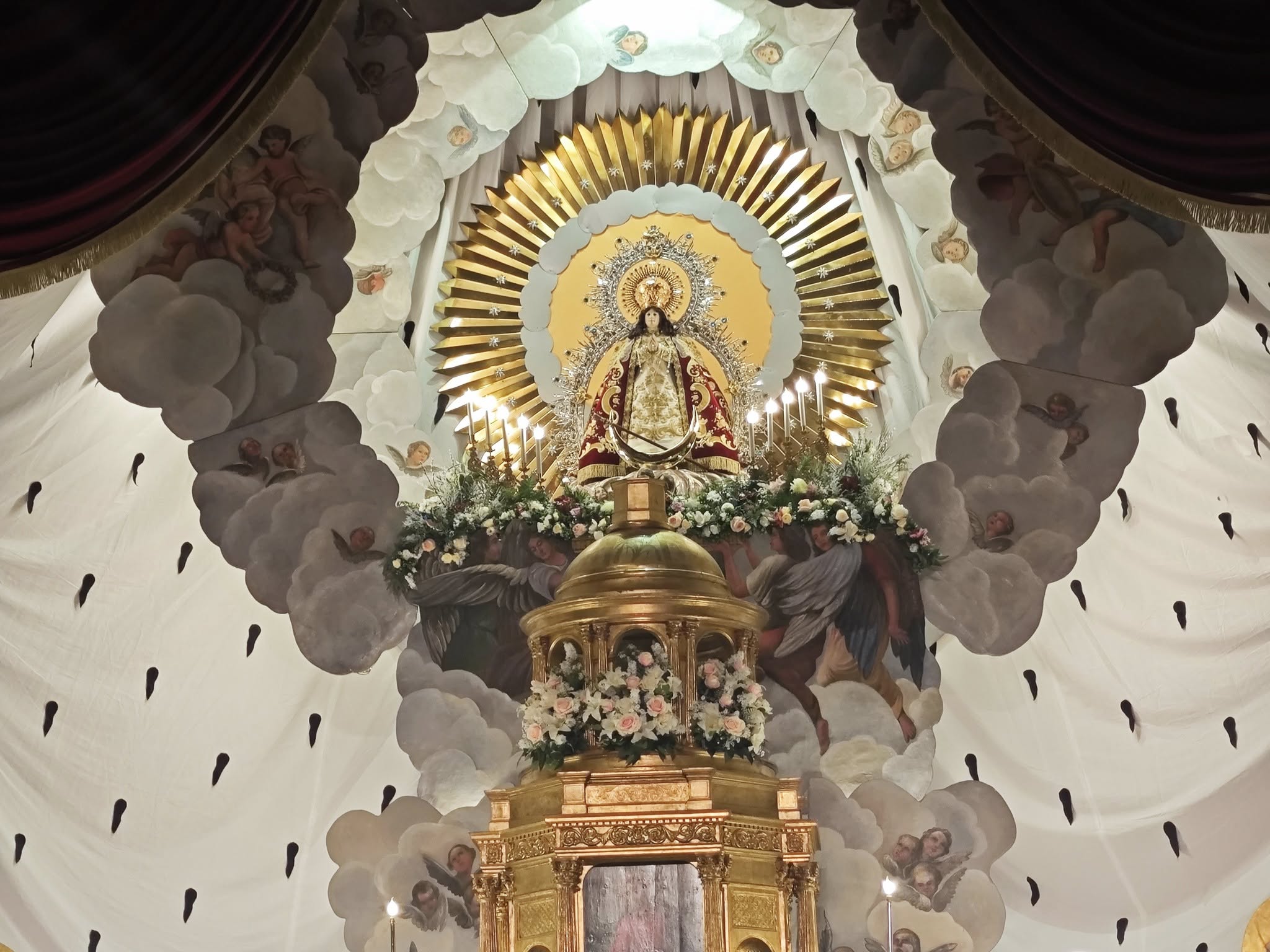 La oscuridad se hace patente en todo el recinto religioso, destacando únicamente el trono situado a una altura de unos quince metros donde la imagen de Nuestra Señora de los Ángeles irá ascendiendo hasta ocupar la parte central del mismo. Esto solamente puede apreciarse y sentirse en el interior de cada uno cuando se presencia en directo pues es muy difícil explicar sentimientos de las personas que llevan en sus corazones ese espíritu y esa devoción hacia la Virgen de los Ángeles.