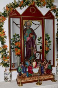 Sumamente pequeña la estancia, esta presidida por la imagen del santo titular. De escaso valor artístico, pero de enorme valor sentimental, pues José López, el que fuera enterrador de la localidad durante muchos años, pidió dinero entre sus convecinos hasta que logró lo suficiente para comprarla. La imagen representa a un hombre mayor con el libro y las llaves en la mano, preside el retablillo en la pared frontal de la estancia, flanqueado a diestra por la virgen de Fátima y a siniestra por la imagen antigua del santo patrón, pero de menor tamaño, y aunque con los mismos atributos de libro y llave se le representa como un hombre joven.
