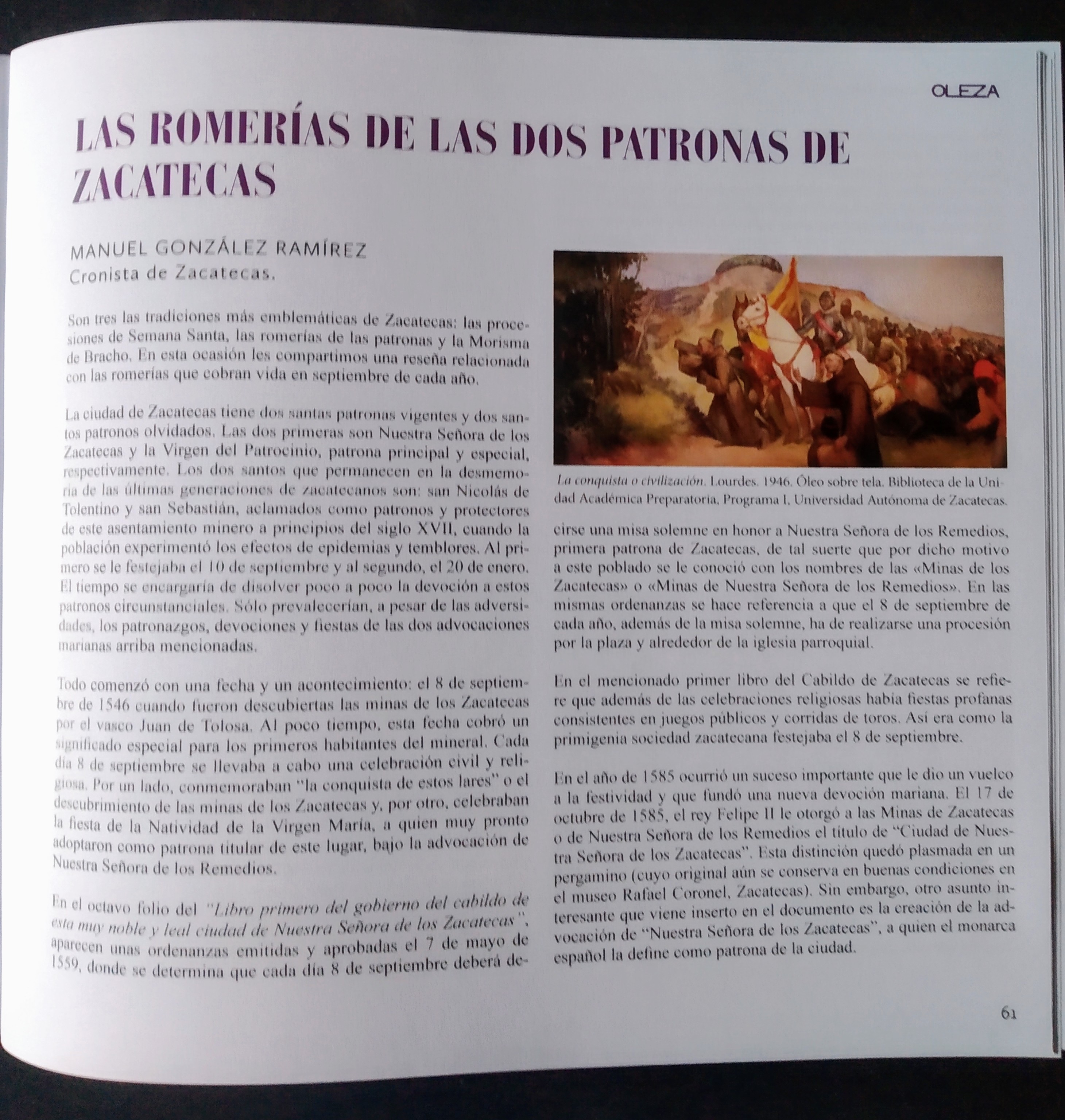 Esta revista que edita todos los años la Asociación Cultural Revista Oleza de Orihuela (ACROO) y cuenta con la colaboración de distintas personalidades entre las que destaca, otro año más la del Cronista del Estado de Zacatecas, Manuel González Ramírez que acerca a los lectores a la Romería septembrina de esta ciudad mexicana y a su devoción a la Señora de los Zacatecas y la del Patrocinio. JAAR