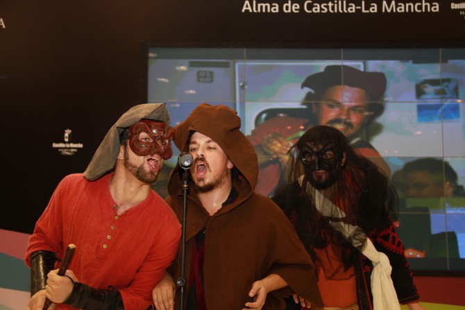 A lo largo de la mañana del Día de Guadalajara el grupo Animarte representó una de las actuaciones que llevará a cabo en el Tren. También los caballeros medievales de Sigüenza recordaron a la reina Doña Blanca, en memoria de quien se organizan cada año en el mes de julio las Jornadas Medievales. En 2014 llegan a su XV edición. Los seguntinos representaron la lucha fratricida entre el rey Pedro I “el Cruel”, que confinara a la reina en el castillo de la ciudad del Doncel, y Enrique de Trastámara, quien venció a su hermanastro con la ayuda del caballero francés Beltrán Duguesclín. La escenificación de la pelea mortal da cada año a los seguntinos, hoy también en FITUR, la oportunidad de “vengar” a Doña Blanca.