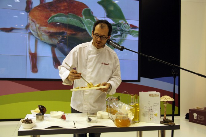 En el apartado gastronómico de la jornada de hoy en el expositor de CLM en FITUR, también hubo participación seguntina. Enrique Pérez, cocinero jefe del restaurante El Doncel, disertó una breve ponencia sobre los recursos micológicos de la Sierra Norte, que incluyen la trufa. Pérez habló sobre la forma de conservar los hongos y setas en el tiempo y cocinó en directo una sencilla pero sabrosa receta basada con el huevo, los hongos y la trufa como protagonistas.