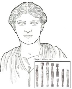 Uno de los pequeños objetos, elaborados en hueso, que no nos deja indiferentes en nuestra visita al museo emeritense son precisamente estas hieráticas figurillas antropomorfas. Su marcado esquematismo permite reconocer, casi de inmediato, sus atributos sexuales. Su ejecución sobre el hueso metacarpo de vacuno, deja entrever su sección ligeramente curvada. Plana en su reverso (parte interior del hueso) y redondeada en el frontal de la representación que se correspondería con el contorno exterior de dicho hueso.