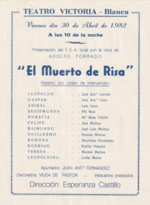 Tal día como hoy, pero de 1982, a las 22 horas, en el Teatro Victoria se puso en escena “El muerto de risa”, de Adolfo Torrado, por T.E.A. local.