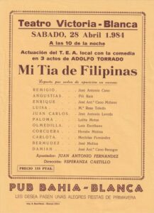 Tal día como hoy, pero de 1984, el grupo T. E. A. pone en escena la comedia de Adolfo Torrado “Mi tía de Filipinas”, en el Teatro Victoria, a las 22 horas.