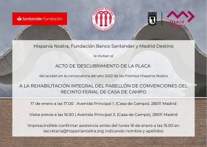 El próximo martes 17 de enero, tendrá lugar el descubrimiento de la placa del accésit a la rehabilitación integral del Pabellón de Convenciones del recinto ferial de Casa de Campo, otorgado en la convocatoria de 2022 de los Premios Hispania Nostra, como reconocimiento «a los profesionales que han realizado la intervención, en pro de la revitalización de un área degradada de la Casa de Campo de Madrid».