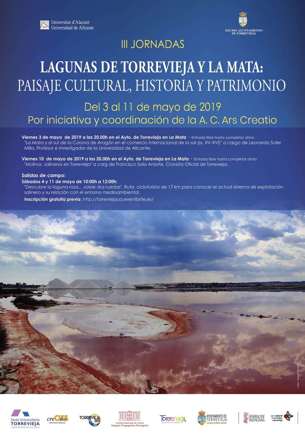 Los días 3, 4, 10 y 11 de mayo se celebran las terceras jornadas multidisciplinares “Lagunas de Torrevieja y La Mata: Paisaje Cultural, Historia y Patrimonio”, organizadas por la sede de la UA en Torrevieja, el Ayuntamiento y la asociación cultural Ars Creatio. Las jornadas contarán con dos conferencias los días 3 y 10 de mayo, a las 20 horas, en el Ayuntamiento de Torrevieja, con entrada libre. Además, se realizarán dos rutas cicloturistas de 17 kilómetros para conocer el actual sistema de explotación salinera y su relación con el entorno medioambiental. Las rutas serán los días 4 y 11 de mayo, de 10 a 12 horas, con salida desde el monumento al salinero. Las salidas de campo están limitadas a 25 personas, debiendo inscribirse en http://torreviejaua.eventbrite.es.