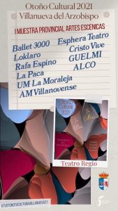 Las Artes Escénicas, abrieron las representaciones, el sábado 9 de octubre, de Teatro Provincial con la obra “Mitad y Mitad” por la Compañía ballet 3000 de Arjonilla; el domingo habrá una Proyección Conmemorativa “Semana del Cine Español”. Todos los sábados se realizará una representación, el siguiente será el grupo Loklaro Producciones de Jaén, con el estreno de la obra “¡Ay Carmela!”; el IES Nieves López Pastor, con “Festividad de los Santos”. En noviembre será la Apertura del Curso Escuela Municipal de Teatro. El grupo La Paca de Jaén, representará, “Te acuerdas del Fin del Mundo”; Esphera Teatro de Andújar, con la obra “Enciérrame Contigo”, “Cristo Vive” de esta localidad ofrecerá la representación “Tú, yo y la tertulia”, seguirá GUELMI, con el espectáculo “Vergüenza”, clausurándose por Alco Teatro con “Arsénico por compasión”. Faltan por concretar algunas actuaciones y lugares.