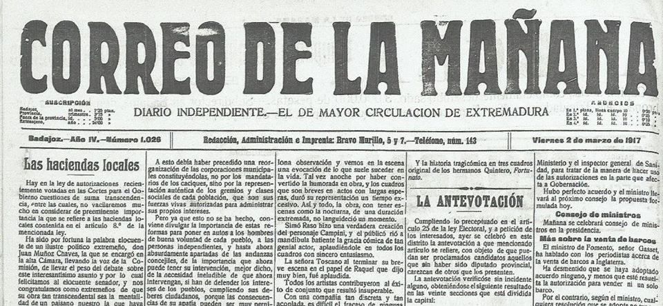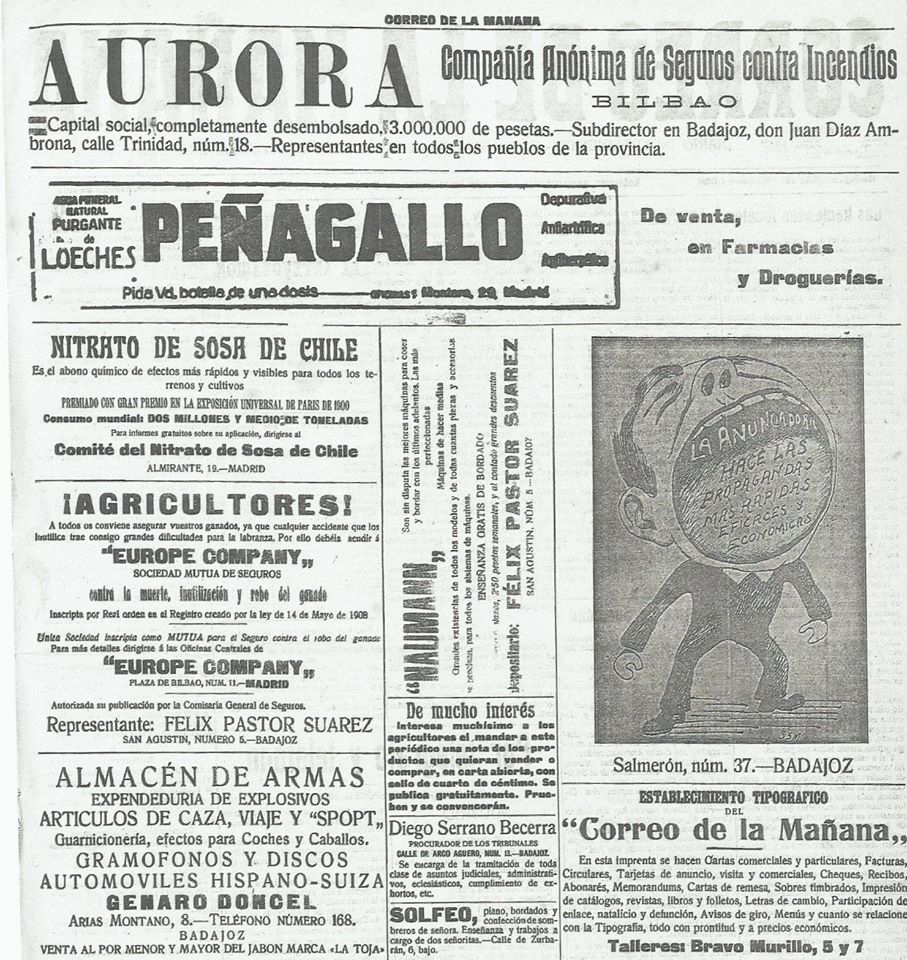 En ese mismo mes de marzo, el veintiuno, se daba cuenta de la petición de mano de la gentil y bella señorita Eulalia Ríos Gragera por el joven industrial, Antonio Agudo Conde. Entre otros anuncios que las páginas del diario Correo de la mañana, destacaba la máquina de escribir Smith Premier-10, como la mejor del mundo. Seguros Aurora, con un capital social de tres millones de pesetas. El Agua Peñagallo de Loeches (Madrid), de la que se decía quera mineral natural purgante. Y Nitrato de Sosa de Chile para los terrenos y cultivos.