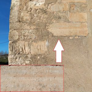 Tras la última visita que pudimos realizar hasta la localidad en febrero de este año, al analizar con detenimiento los sillares del edificio, nos percatamos de que en uno cercano a la entrada del templo, y donde se aprecian una serie de incisiones verticales (cuya funcionalidad ya fue explicada en un artículo anterior: https://davidgomezdemora.blogspot.com/2023/01/sillares-con-incisiones-en-la-iglesia.html), advertimos una serie de formas cuadradas cortadas por una diagonal, que nada tienen que ver con el resto de las que hay a su alrededor.