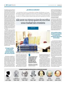 En plena era de la información masiva y de la amenaza de las «falte news», el oficio de cronista se toma imprescindible, complementario con la labor de archiveros, medios de comunicación e investigadores. Sin embargo, tres de los principales municipios de la provincia no tienen cronista oficial: Alicante, Elche y Alcoy. En lo que respecta a la capital, no existe tal cargo desde 2009, cuando el puesto quedó vacante tras la reestructuración del equipo de gobierno. El último cronista José María Bonastre, funcionario de carrera, fue recolocado dentro del organigrama municipal desde entonces, quince años de vacío. La situación de Alicante contrasta con la de otras capitales de provincia…