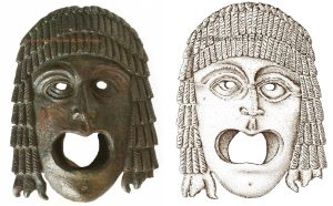 La simbología de esta máscara es una clara alegoría a la musa griega Melpómene, relacionada con la tragedia. Recordemos que en la simbología de las artes escénicas distinguimos entre la comedia, personificada en la musa Talía y la tragedia asociada a Melpómene como ya hemos visto. Llama la atención el peinado, a base de la superposición de varias capas de titabuzones. Esta es sin lugar a dudas, una de las piezas más representativas de la villa romana de Torre Águila (Barbaño, Badajoz), expuesta actualmente en el Museo Nacional de Arte Romano (Mérida). Se trata además de una de las obras más solicitadas en algunas de las exposiciones temporales relacionadas con el teatro.